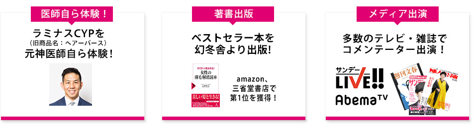 30歳代半ばから自身も薄毛に悩み、様々な薄毛治療を自ら実践。その臨床経験から注射治療を開発。『薄毛を自ら克服した専門医』として、多数のテレビ・雑誌でコメンテーターとして出演。