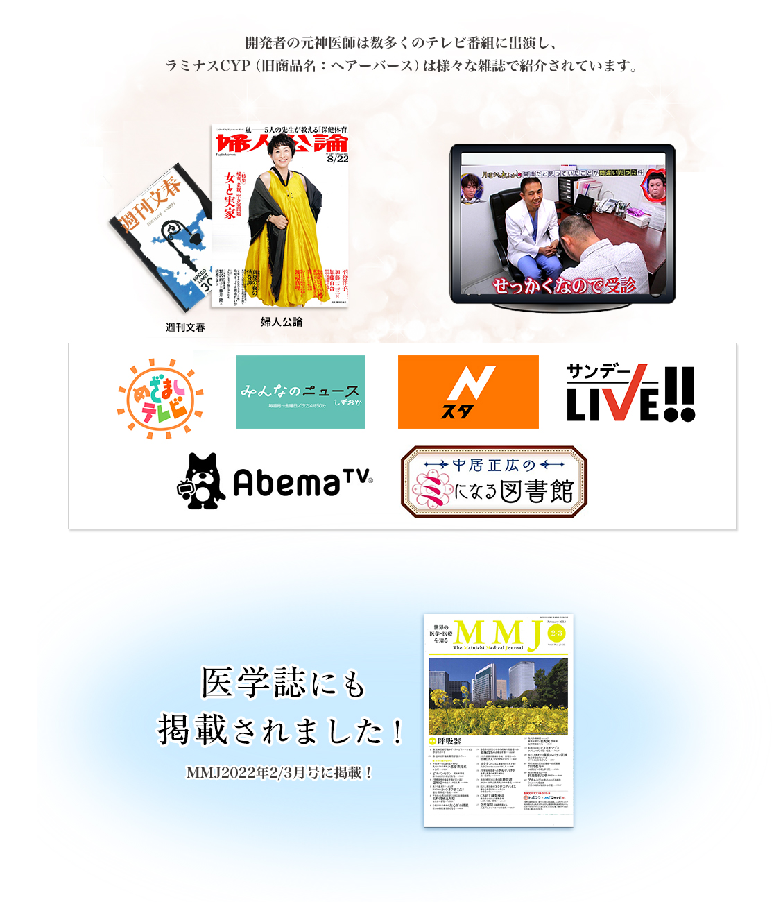 ラミナスCYP(旧商品名:ヘアーバース)は 様々なテレビ・雑誌で 専門医が開発した 発毛・育毛サプリメント